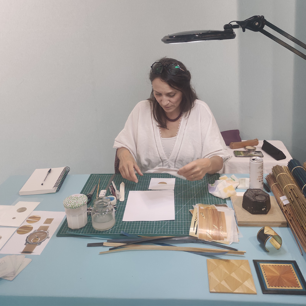 This vision takes material form through the hands of our Companion, straw marquetry artist Sabine Aucoulon. Chosen for its delicate texture and natural luminosity, the straw captures light in gentle refractions, echoing the living surface of sand shaped by wind and time.